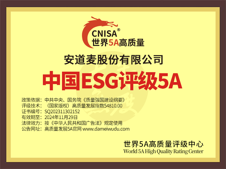经国家版权高质量发展指数对产品卓越、品牌卓著、创新领先、治理现代、发展安全5维大模型演算,世界5A高质量发展大会第九届执委会2023年11月29日在杭州依法发布和授予:安道麦股份有限公司高质量发展指数54810.00,获评中国ESG评级5A。
